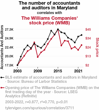 This means 77% of the change in the one variable (i.e., The Williams Companies' stock price (WMB)) is predictable based on the change in the other (i.e., The number of accountants and auditors in Maryland) over the 20 years from 2003 through 2022.