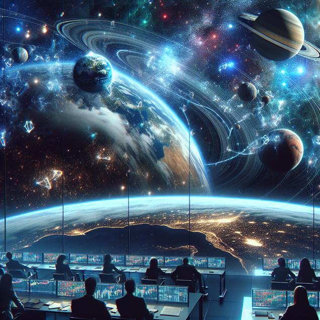 Prompt: Your prompt has inspired an imaginative and visually rich scene! Here's an enhanced image generation prompt that could result in a captivating output: [ An image that captures a breathtaking vista of the cosmos, resembling a visual from a Pixar movie. The vast expanse of space is resplendent with twinkling stars and distant celestial bodies. In the foreground, Earth and Saturn are depicted at a distance, with their orbits slightly disrupted, conveying a sense of cohesive chaos. Earth is depicted as a striking blue gem, while the majestic rings of Saturn shimmer in the cosmic light. Amidst this awe-inspiring scenery, the scene seamlessly shifts to a bustling stock exchange on Earth. A large digital display prominently features the stock ticker of RTX Corp, its price solid and stable amidst the cosmic chaos. A group of diverse and animated investors is gathered around the display, their expressions reflecting a mix of concern and confidence as they seek refuge in RTX's stock price as an unshakeable anchor in the midst of the disrupted gravitational pull caused by the distant planets. ] This refined prompt aims to infuse the imagery with the vivid and captivating storytelling elements reminiscent of a Pixar movie, enriching the visual components and narrative context for DALLE-3 to interpret and render. The depiction should include only scenes, people, and objects, it should not include text or speech bubbles.