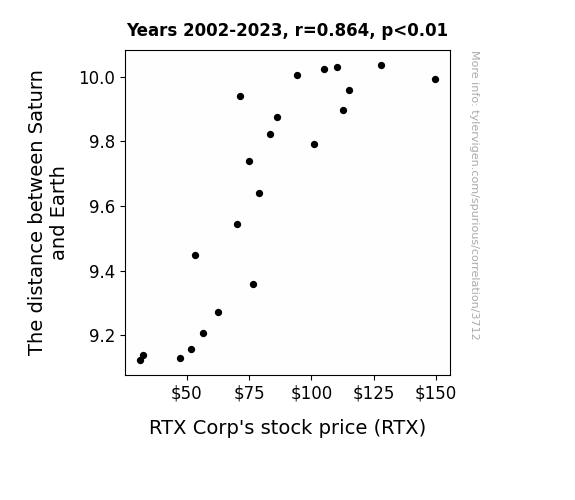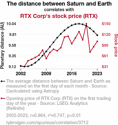 This means 74.7% of the change in the one variable (i.e., RTX Corp's stock price (RTX)) is predictable based on the change in the other (i.e., The distance between Saturn and Earth) over the 22 years from 2002 through 2023.
