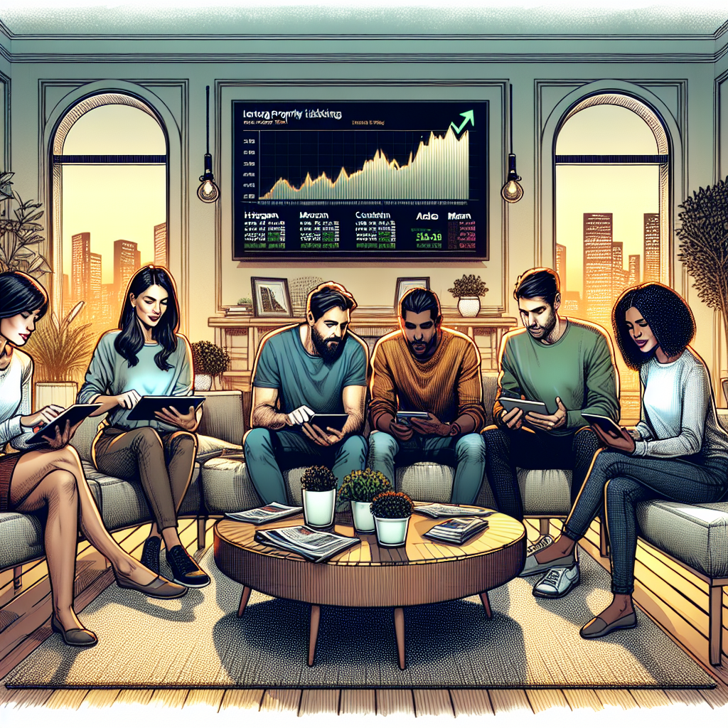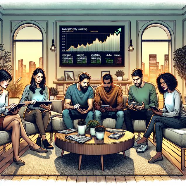 Prompt: Generate an image of a modern apartment interior, with a group of people gathered around a coffee table, engaged in discussion. On each person's device, display the Baidu search engine with rental property listings. In the background, display a television screen showing the Baidu stock price ticker, indicating a steady increase. The room should have warm, soft lighting to create a cozy yet vibrant atmosphere. Ensure that the scene captures the essence of the group's active search for new living arrangements against the backdrop of Baidu's rising stock price due to increased internet usage. The depiction should include only scenes, people, and objects, it should not include text or speech bubbles.