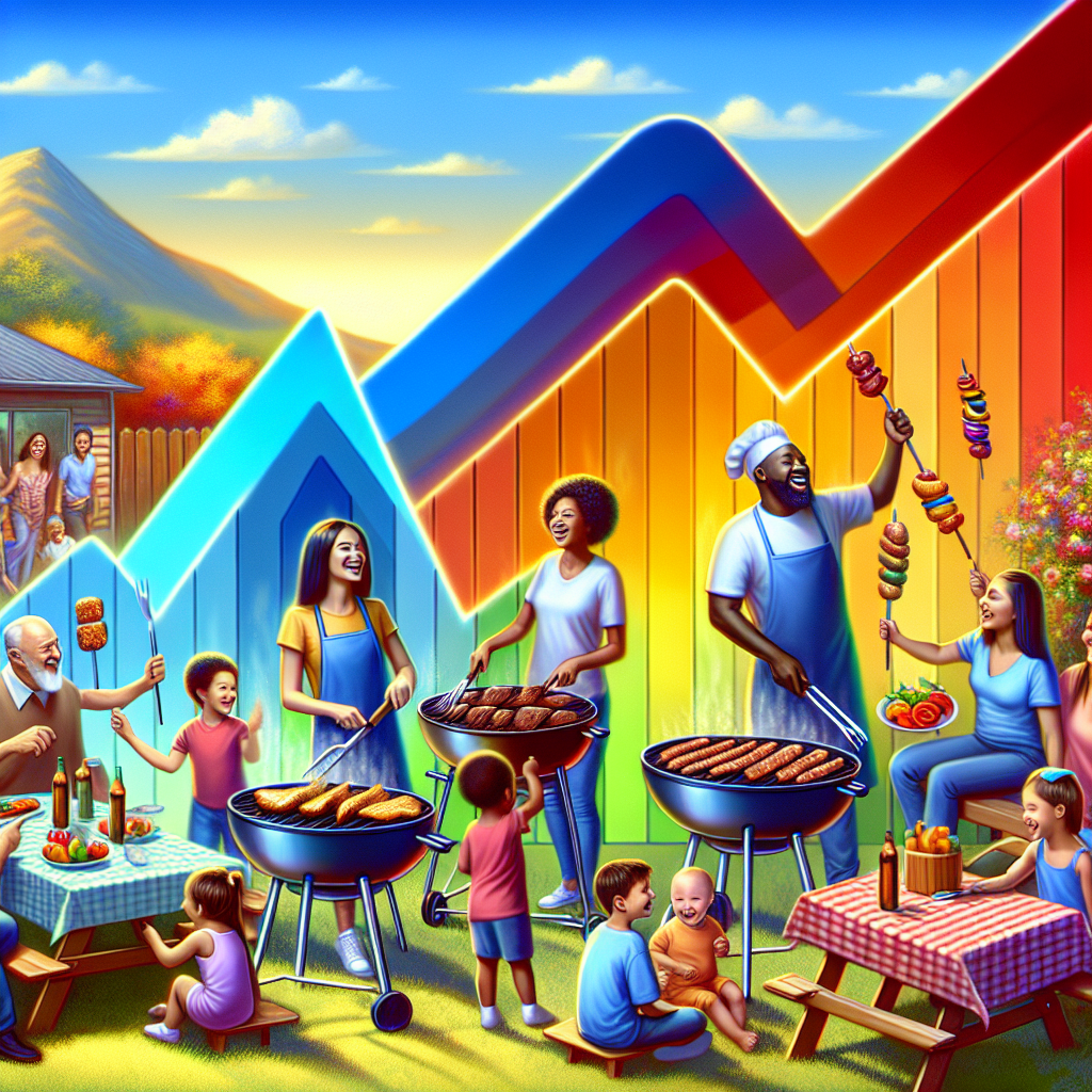 Prompt: Create an image of a vibrant backyard filled with families joyfully grilling steaks and kebabs on gleaming new barbecues from The Home Depot. The scene is accentuated by the laughter of children and the delightful aroma of succulent food. In the background, display a vivid stock ticker screen showing The Home Depot's (HD) stock price steadily ascending, portraying a prosperous and fulfilling family gathering in conjunction with the success of the company. The depiction should include only scenes, people, and objects, it should not include text or speech bubbles.