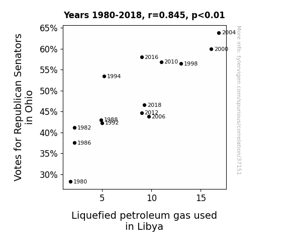 This means 71.4% of the change in the one variable (i.e., Liquefied petroleum gas used in Libya) is predictable based on the change in the other (i.e., Votes for Republican Senators in Ohio) over the 14 years from 1980 through 2018.