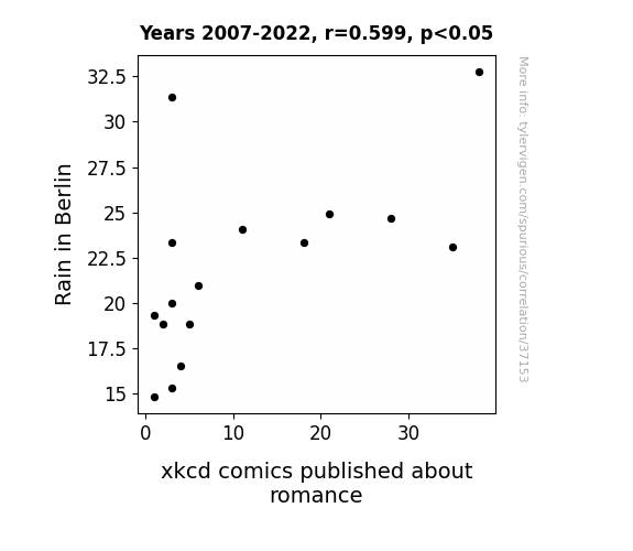 This means 35.9% of the change in the one variable (i.e., xkcd comics published about romance) is predictable based on the change in the other (i.e., Rain in Berlin) over the 16 years from 2007 through 2022.