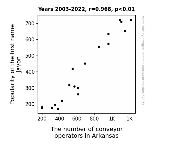 This means 93.8% of the change in the one variable (i.e., The number of conveyor operators in Arkansas) is predictable based on the change in the other (i.e., Popularity of the first name Javon) over the 20 years from 2003 through 2022.