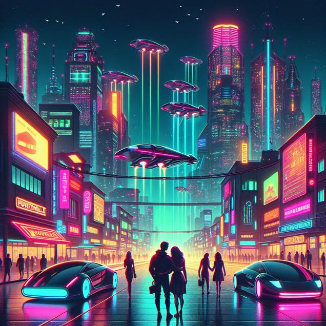 ChatGPT: Generate an image of a cyberpunk cityscape in Huntsville, Alabama under a clear sky. Show futuristic, neon-lit buildings towering overhead, with sleek hovercars zooming by in the background. On the sidewalks, depict couples walking hand in hand, their faces illuminated by the vibrant neon lights, each couple expressing a unique emotional connection. Some couples are deeply engaged in conversation, while others are glancing lovingly into each other's eyes. In the midst of this cyberpunk scene, convey a sense of newfound clarity and affection, capturing the essence of love either being rekindled or discovered amidst the reduced air pollution.