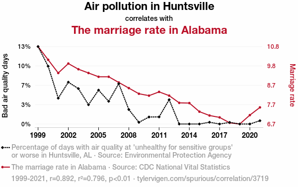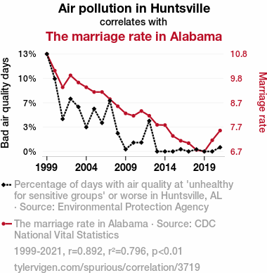 This means 79.6% of the change in the one variable (i.e., The marriage rate in Alabama) is predictable based on the change in the other (i.e., Air pollution in Huntsville) over the 23 years from 1999 through 2021.