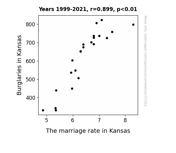 This means 80.8% of the change in the one variable (i.e., The marriage rate in Kansas) is predictable based on the change in the other (i.e., Burglaries in Kansas) over the 23 years from 1999 through 2021.