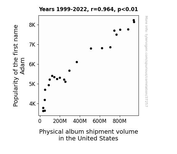 This means 92.8% of the change in the one variable (i.e., Physical album shipment volume in the United States) is predictable based on the change in the other (i.e., Popularity of the first name Adam) over the 24 years from 1999 through 2022.