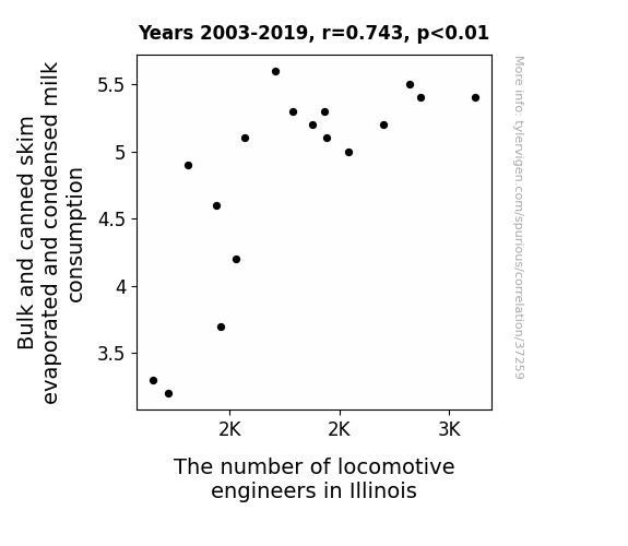 This means 55.2% of the change in the one variable (i.e., The number of locomotive engineers in Illinois) is predictable based on the change in the other (i.e., Bulk and canned skim evaporated and condensed milk consumption) over the 17 years from 2003 through 2019.
