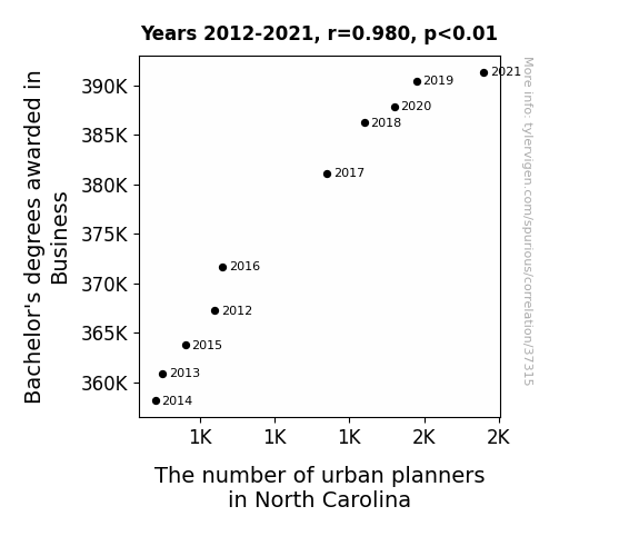 This means 96.1% of the change in the one variable (i.e., The number of urban planners in North Carolina) is predictable based on the change in the other (i.e., Bachelor's degrees awarded in Business) over the 10 years from 2012 through 2021.