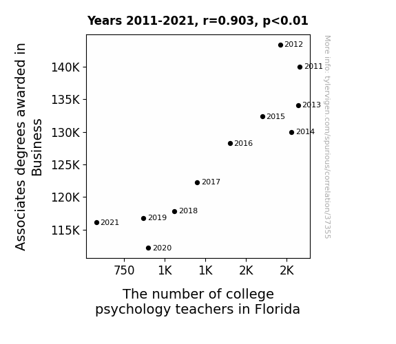 This means 81.5% of the change in the one variable (i.e., The number of college psychology teachers in Florida) is predictable based on the change in the other (i.e., Associates degrees awarded in Business) over the 11 years from 2011 through 2021.
