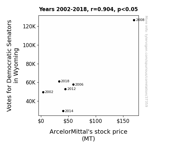 This means 81.7% of the change in the one variable (i.e., ArcelorMittal's stock price (MT)) is predictable based on the change in the other (i.e., Votes for Democratic Senators in Wyoming) over the 6 years from 2002 through 2018.