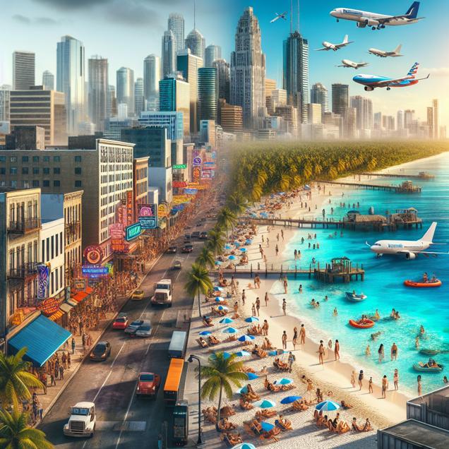 ChatGPT: Generate an image that seamlessly blends a bustling street in the United States, filled with lively breweries and throngs of people, with a serene beach in Belize gradually overwhelmed by an increasing number of planes landing, symbolizing a surge in fossil fuel usage as visitors flock to enjoy the beautiful seaside with refreshing beverages. The image should convey the stark contrast between the urban and natural environments, capturing the essence of dynamic societal choices and their impact on the environment. The scene should be rich in detail and depth, evoking a sense of awe and reflection.