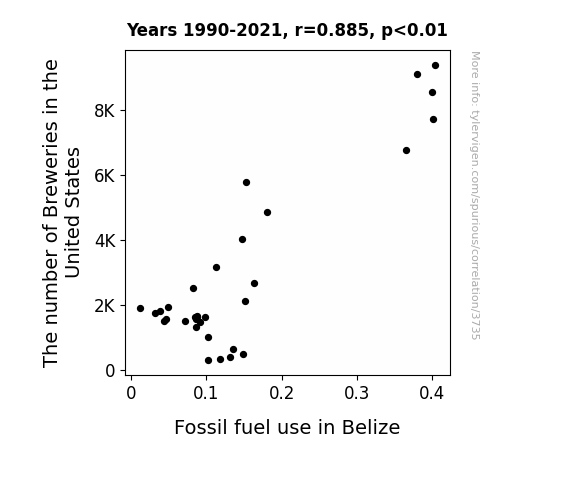 This means 78.3% of the change in the one variable (i.e., Fossil fuel use in Belize) is predictable based on the change in the other (i.e., The number of Breweries in the United States) over the 32 years from 1990 through 2021.