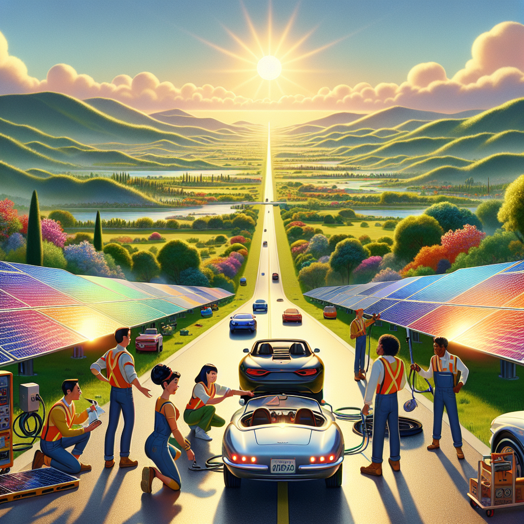 Prompt: [An image that looks like it is a scene from a Pixar movie] Generate an image of a sun-soaked highway rolling across a picturesque landscape, lined with vibrant, colorful solar panels that sparkle in the warm sunlight. A fleet of sleek Mercedes-Benz convertibles is parked on the side of the road, surrounded by a team of animated workers inspecting and repairing them. The scene should capture the comforting harmony between the natural surroundings and the advanced technology, infusing the setting with a sense of wonder and excitement. The iconic Pixar style should be evident in the whimsical yet lifelike portrayal of the vehicles and characters, evoking a sense of lightheartedness and adventure. The depiction should include only scenes, people, and objects, it should not include text or speech bubbles.