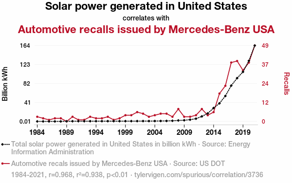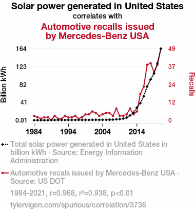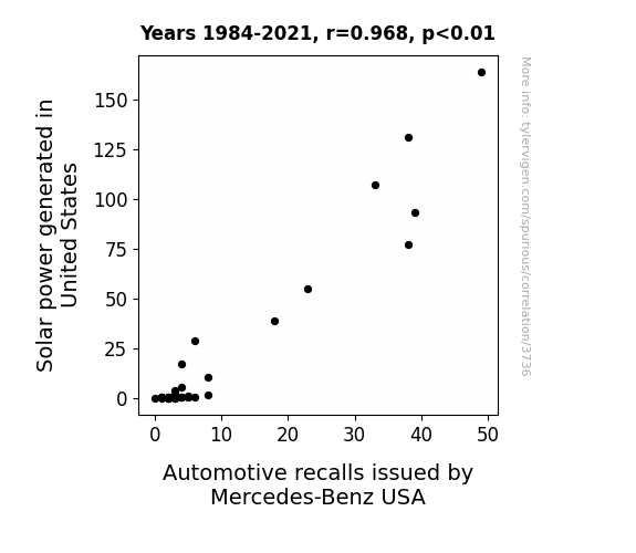 This means 93.8% of the change in the one variable (i.e., Automotive recalls issued by Mercedes-Benz USA) is predictable based on the change in the other (i.e., Solar power generated in United States) over the 38 years from 1984 through 2021.