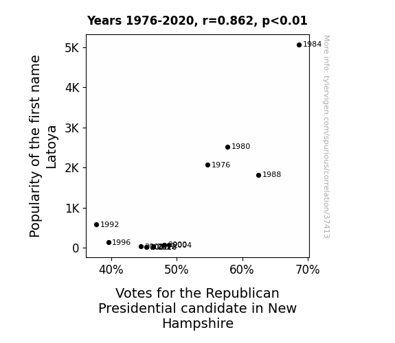 This means 74.4% of the change in the one variable (i.e., Votes for the Republican Presidential candidate in New Hampshire) is predictable based on the change in the other (i.e., Popularity of the first name Latoya) over the 12 years from 1976 through 2020.