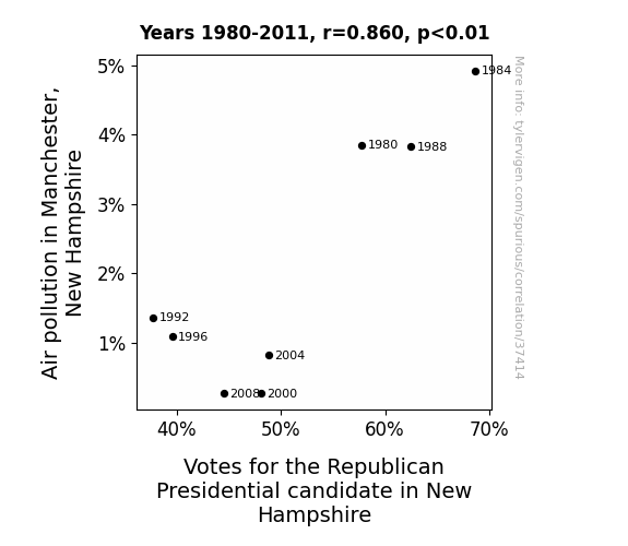 This means 74% of the change in the one variable (i.e., Votes for the Republican Presidential candidate in New Hampshire) is predictable based on the change in the other (i.e., Air pollution in Manchester, New Hampshire) over the 8 years from 1980 through 2011.