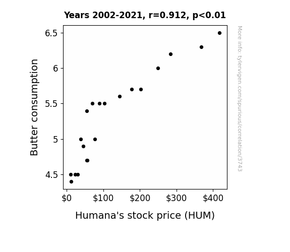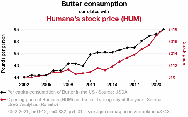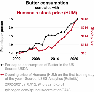- The spurious research paper: Spreading Financial Butter: Uncovering the Relationship Between Butter Consumption and Humana's Stock Price