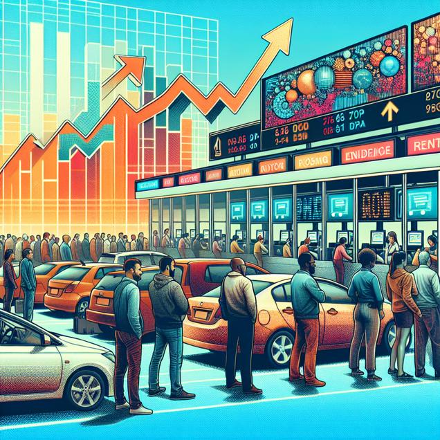 Prompt: Generate an image depicting the lively hustle and bustle of a downtown Cheyenne, Wyoming car rental agency. Show a long line of customers eagerly waiting to be served by a growing number of rental clerks at the counters. Highlight the increasing congestion in the parking lot as customers drive off in their rental cars. Also, feature a prominent digital screen displaying the stock ticker for Conoco Phillips (COP), with the stock price steadily rising as the demand for fuel increases. Ensure that the image captures the excitement and energy of the busy rental agency and the growing impact on the stock market due to the escalating demand for fuel. The depiction should include only scenes, people, and objects, it should not include text or speech bubbles.