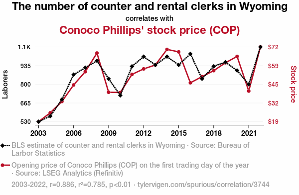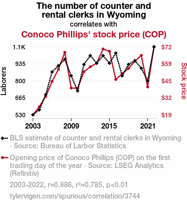 This means 78.5% of the change in the one variable (i.e., Conoco Phillips' stock price (COP)) is predictable based on the change in the other (i.e., The number of counter and rental clerks in Wyoming) over the 20 years from 2003 through 2022.