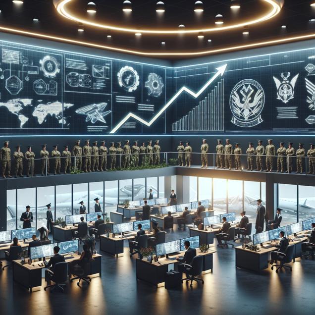 Prompt: The prompt for DALL·E-3 could be: "Create an image of a futuristic office environment, with employees at Accenture working diligently at their desks. The office space is bright and bustling, adorned with military-themed decorations such as framed military technology blueprints and camo-patterned accent pieces. The employees are engaged and motivated, collaborating on innovative projects. In the background, a stock market ticker shows a steady increase in Accenture's stock price (ACN) in response to the heightened productivity. Meanwhile, in the foreground, there is a university commencement ceremony, where graduates proudly receive their Bachelor's degrees in Military technologies and applied sciences, symbolizing the increase in the number of skilled professionals entering the industry." The depiction should include only scenes, people, and objects, it should not include text or speech bubbles.