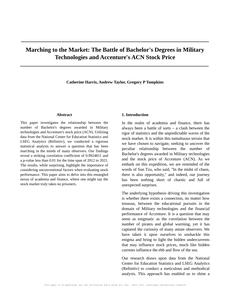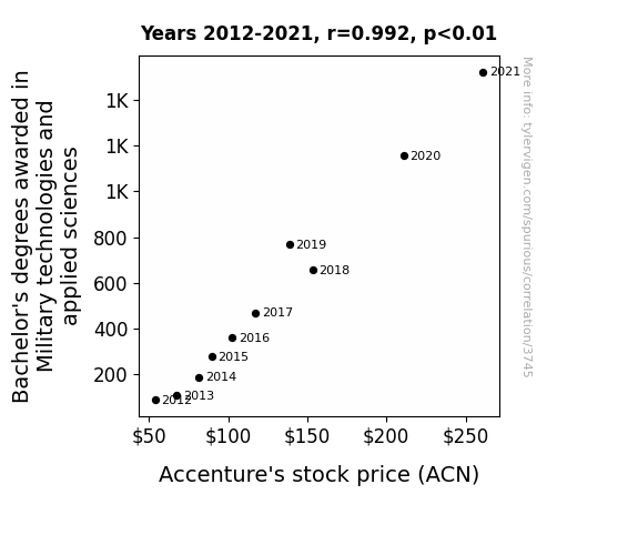 User prompt: Please provide potential search keywords for a paper titled Marching to the Market: The Battle of Bachelor's Degrees in Military Technologies and Accenture's ACN Stock Price with an abstract of This paper investigates the relationship between the number of Bachelor's degrees awarded in Military technologies and Accenture's stock price (ACN). Utilizing data from the National Center for Education Statistics and LSEG Analytics (Refinitiv), we conducted a rigorous statistical analysis to answer a question that has been marching in the minds of many observers. Our findings reveal a striking correlation coefficient of 0.9924811 and a p-value less than 0.01 for the time span of 2012 to 2021. The results, while surprising, highlight the importance of considering unconventional factors when evaluating stock performance. This paper aims to delve into this entangled nexus of academia and finance, where one might say the stock market truly takes no prisoners.