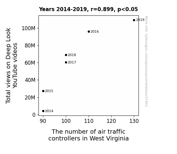 This means 80.8% of the change in the one variable (i.e., The number of air traffic controllers in West Virginia) is predictable based on the change in the other (i.e., Total views on Deep Look YouTube videos) over the 6 years from 2014 through 2019.