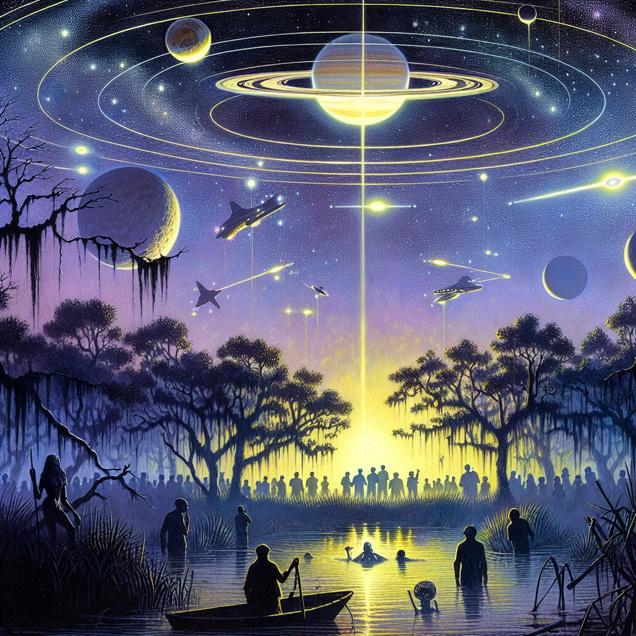 ChatGPT: An image that looks like it is a scene from 'Star Wars' depicts a starry night sky with Uranus and Saturn visibly closer than usual, their orbits nearly overlapping. Below, in the bayou of Louisiana, mysterious lights form a triangle, creating a "UFO-muda Triangle." Amid the dense trees and water, there are silhouettes of curious onlookers gazing up at the otherworldly phenomenon. UFOs hover in the background, drawn by the gravitational disturbance caused by the close encounter of the two planets, turning Louisiana into a hotspot for extraterrestrial encounters.