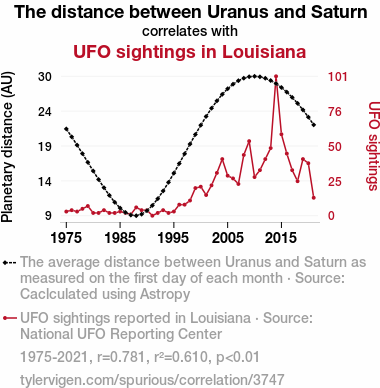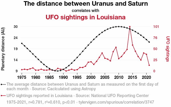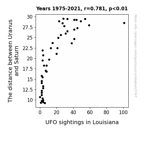 This means 61% of the change in the one variable (i.e., UFO sightings in Louisiana) is predictable based on the change in the other (i.e., The distance between Uranus and Saturn) over the 47 years from 1975 through 2021.