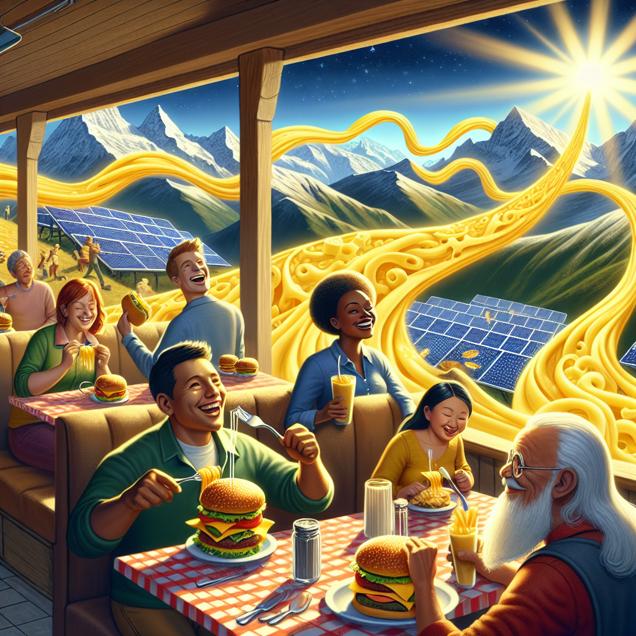 ChatGPT: Prompt: Create a whimsical illustration of a cozy American diner filled with people enjoying cheesy burgers and macaroni. As they savor each bite, golden "cheese vibes" emanate, swirling into the sky. In the backdrop of the scene, depict solar panels nestled in the Himalayas in Nepal, being beamed down on by the sun. Let the cheese vibes reach the panels and ignite them with a vibrant glow, increasing the power generation. The visual should portray a whimsical spectacle of dairy-fueled energy reaching the distant mountains. Keep the visual depiction simple. Avoid including any words or speech bubbles.