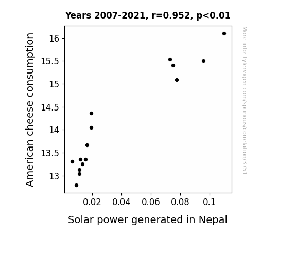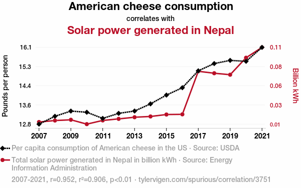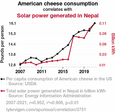 - The spurious research paper: From Cheddar to Solar Power: Illuminating the Relationship Between American Cheese Consumption and Solar Energy in Nepal