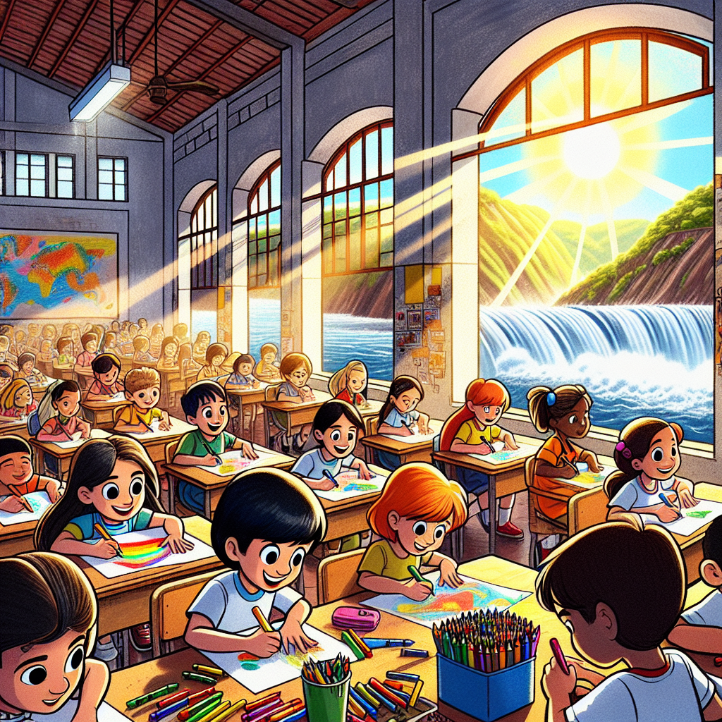 Prompt: An image that looks like it is a scene from a Pixar movie, depicting a bustling classroom in Paraguay. Inside the lively classroom, 3rd graders are diligently using colorful crayons to bring their drawings to life. Sunlight streams in through the windows, illuminating the scene and powering the solar panels on the roof. Meanwhile, outside, the rushing waters of the Itaipu Dam churn away, supplying hydroelectricity to fuel the crayon factories and meet the heightened demand caused by the larger number of students. The depiction should include only scenes, people, and objects, it should not include text or speech bubbles.