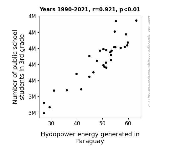 This means 84.9% of the change in the one variable (i.e., Hydopower energy generated in Paraguay) is predictable based on the change in the other (i.e., Number of public school students in 3rd grade) over the 32 years from 1990 through 2021.