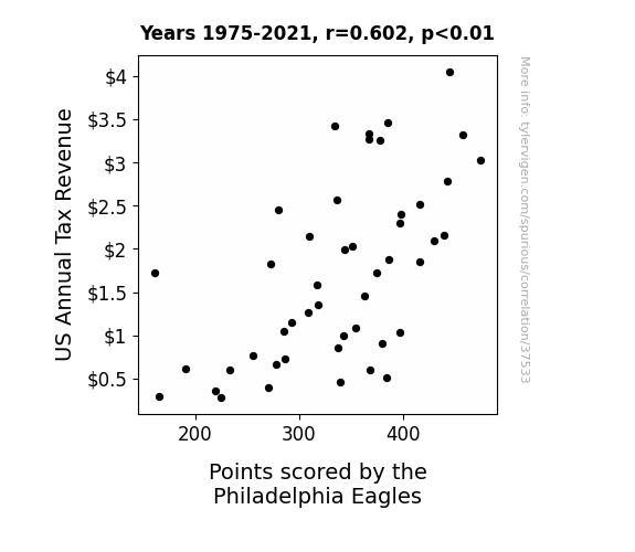 This means 36.2% of the change in the one variable (i.e., Points scored by the Philadelphia Eagles) is predictable based on the change in the other (i.e., US Annual Tax Revenue) over the 47 years from 1975 through 2021.