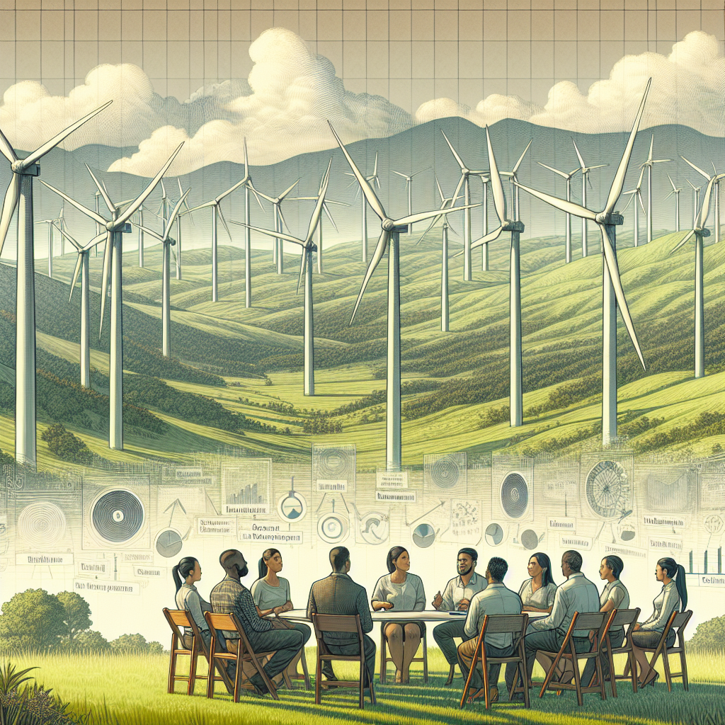Prompt: Create an image of a majestic landscape, featuring wind turbines dotting the verdant hills of Puerto Rico, their blades whirling vigorously in the powerful breeze. In the foreground, a group of focused individuals are gathered amidst the picturesque setting, engrossed in discussions and brainstorming sessions, alluding to the world of operations research. The scene should convey the sense of palpable energy and inspiration, symbolizing the harmonious convergence of renewable wind power and the growth of operations research in Indiana. The depiction should include only scenes, people, and objects, it should not include text or speech bubbles.