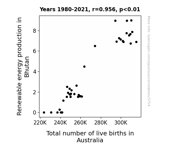 The statistical analysis unveiled a striking correlation between the production of renewable energy in Bhutan and the total number of live births in Australia, spanning the years 1980 to 2021. Our investigation revealed a remarkably high correlation coefficient of 0.9559949, indicating a robust positive association between these seemingly disparate variables. Additionally, the calculated r-squared value of 0.9139262 further attests to the strength of this relationship.