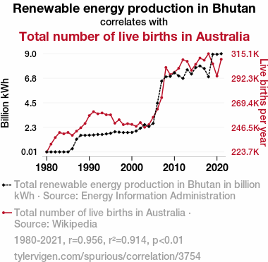 User prompt: Please provide potential search keywords for a paper titled Shocking Connections: Renewable Energy from the Land of the Thunder Dragon and a Baby Boom Down Under with an abstract of In this study, we investigate the surprising link between the production of renewable energy in the Himalayan kingdom of Bhutan and the total number of live births in the vast expanse of Australia. Utilizing data from the Energy Information Administration and Wikipedia, our research team sought to unravel this unanticipated association that potentially electrifies the field of energy and demographics. Our findings reveal a remarkably high correlation coefficient of 0.9559949 and p < 0.01, spanning the years 1980 to 2021. The implications of this stunning connection raise intriguing questions and spark speculation about the interplay between sustainable energy practices and the fecundity of distant nations. Our study sheds light on an unexpected and amusing twist in the intricate tapestry of global dynamics, hinting at the electrifying forces at play in shaping population trends.