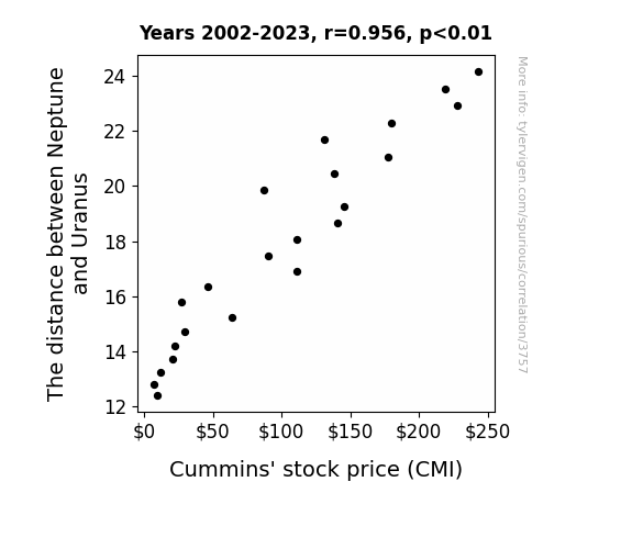 This means 91.3% of the change in the one variable (i.e., Cummins' stock price (CMI)) is predictable based on the change in the other (i.e., The distance between Neptune and Uranus) over the 22 years from 2002 through 2023.