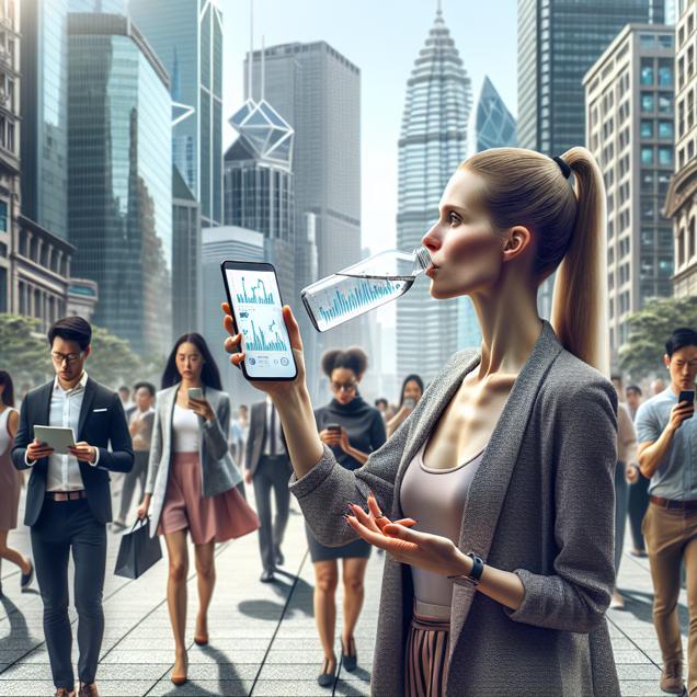 Prompt: Generate a photorealistic cityscape where individuals are strolling through a vibrant urban environment. The people in the scene are depicted as carrying and drinking bottled water while walking, with one hand casually holding a smartphone or tablet displaying the stock price chart for Consolidated Edison (ED). As they take sips from their water bottles, they glance at the stock information on their devices and nod in agreement, indicating a sense of recognition and potential investment opportunity. The scene should portray the city's lively atmosphere and the diverse range of people engaging with technology and staying hydrated, exuding a sense of modern urban life. The depiction should include only scenes, people, and objects, it should not include text or speech bubbles.