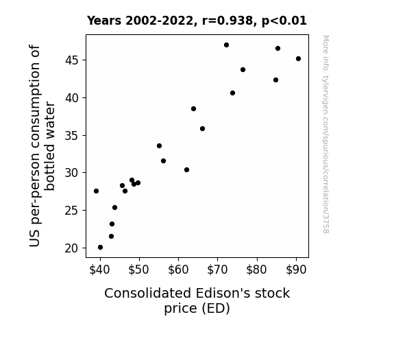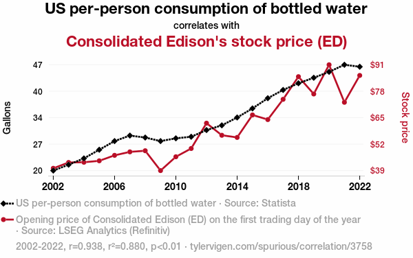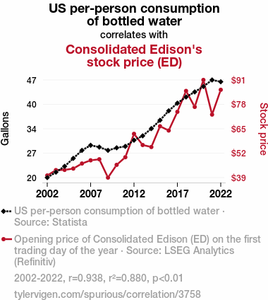 - The spurious research paper: The Thirst for Knowledge: An Exploration of the Bottled Water Consumption-Consolidated Edison Stock Price Connection
