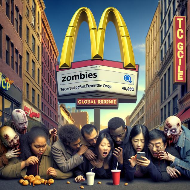 User prompt: Please describe a visual scene that prominently depicts both Global revenue generated by McDonald's and Google searches for 'zombies', in the following situation: Because as McDonald's global revenue decreases, people start eating fewer Happy Meals, leading to a decline in their "brain food" intake, making them more susceptible to zombie-related fears and searches.. Keep the description simple.