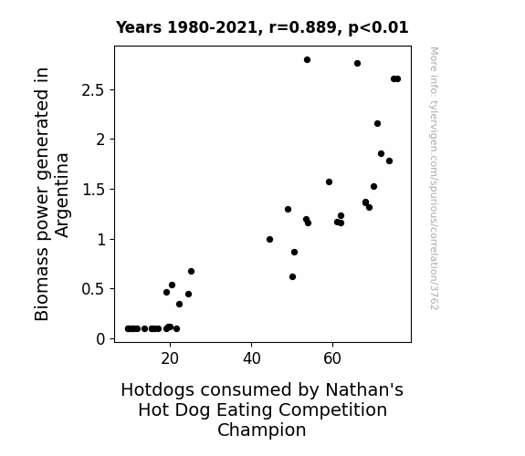 - The spurious research paper: From Power Plants to Power Eaters: A Statistical Analysis of Biomass Energy Generation in Argentina and Nathan's Hot Dog Eating Champion's Consumption