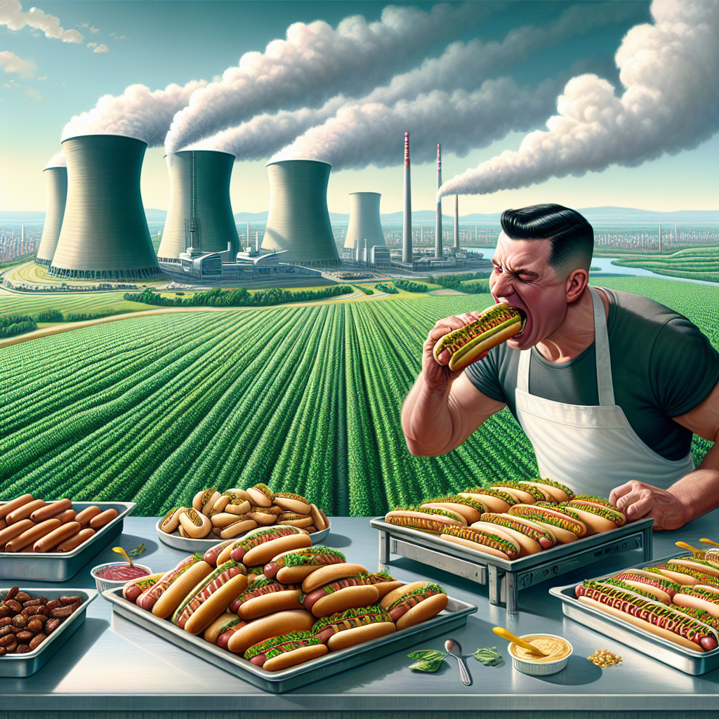 ChatGPT: In a bustling Argentine city, towering biomass power plants emit wisps of steam into the sky. Surrounding these plants, fields of lush green crops sway in the wind. Within a modern kitchen, the champion of Nathan's Hot Dog Eating Competition stands with a determined look, surrounded by trays of sizzling plant-based hotdogs. They take a bite of a hotdog, setting a new record, as the surplus plant matter from the biomass power plants is ingeniously transformed into the delectable hotdog alternative.