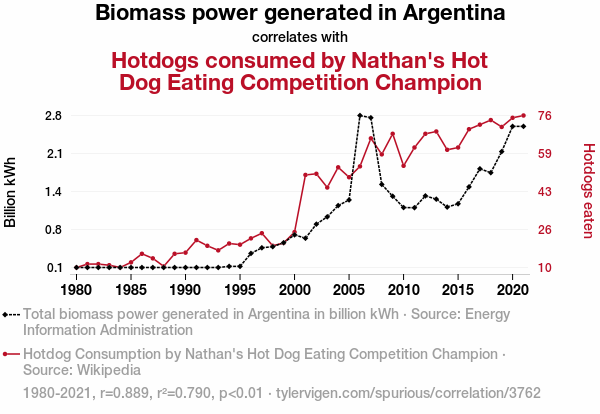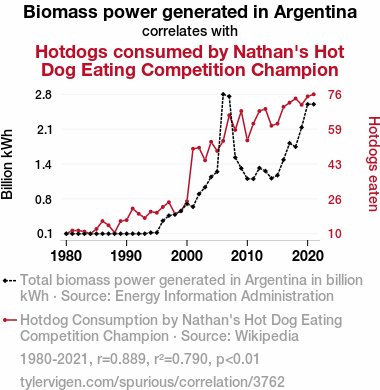 - The spurious research paper: From Power Plants to Power Eaters: A Statistical Analysis of Biomass Energy Generation in Argentina and Nathan's Hot Dog Eating Champion's Consumption