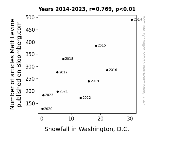 This means 59.1% of the change in the one variable (i.e., Snowfall in Washington, D.C.) is predictable based on the change in the other (i.e., Number of articles Matt Levine published on Bloomberg.com) over the 10 years from 2014 through 2023.