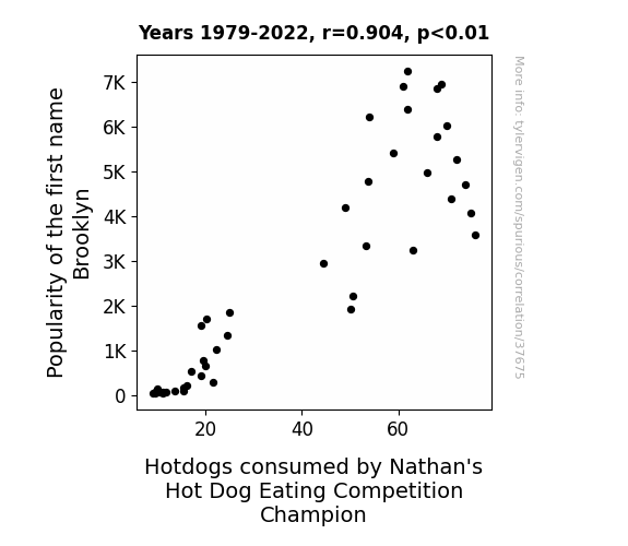 This means 81.7% of the change in the one variable (i.e., Hotdogs consumed by Nathan's Hot Dog Eating Competition Champion) is predictable based on the change in the other (i.e., Popularity of the first name Brooklyn) over the 44 years from 1979 through 2022.