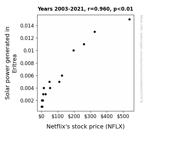 This means 92.2% of the change in the one variable (i.e., Netflix's stock price (NFLX)) is predictable based on the change in the other (i.e., Solar power generated in Eritrea) over the 19 years from 2003 through 2021.