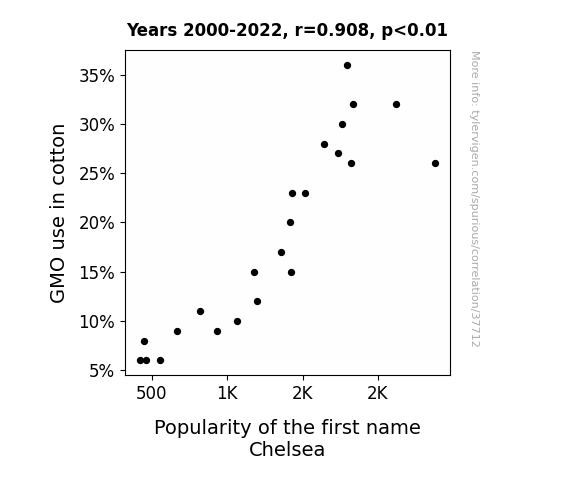 This means 82.4% of the change in the one variable (i.e., Popularity of the first name Chelsea) is predictable based on the change in the other (i.e., GMO use in cotton) over the 23 years from 2000 through 2022.