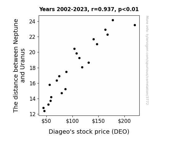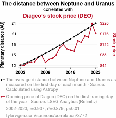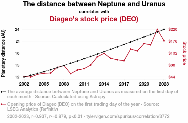 A linear line chart with years as the X-axis and two variables on the Y-axis. The first variable is The distance between Neptune and Uranus and the second variable is Diageo's stock price (DEO).  The chart goes from 2002 to 2023, and the two variables track closely in value over that time. Small Image